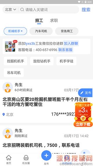 4、【求职招聘】页主要分为两大块,一是招工二是求职,用户可以根据自己的需要进行选择。