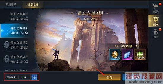 1)遗忘之地分为19层,解锁关卡需达到对应的等级,关卡等级越高,通关所获得的奖励越丰富。每日有2次免费挑战机会,挑战次数可额外进行购买。当以SSS的评价通过关卡时,可解锁扫荡功能,后续可以直接扫荡,无需再挑战(扫荡获取的奖励与SSS通关奖励一致)。