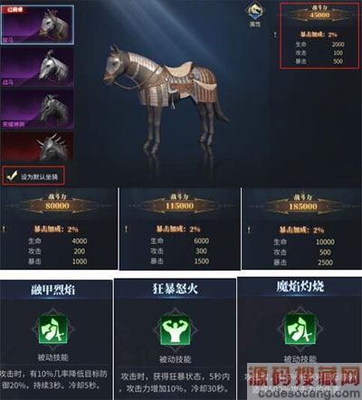 激活坐骑可以提升生命值、攻击力、暴击以及暴击加成。不同的坐骑提供的属性增幅也不同,有的坐骑还拥有坐骑技能,具体坐骑效果可在坐骑页面进行查看。如需切换骑乘的坐骑,选中目标坐骑,在左下角勾选”设为默认坐骑”即可。