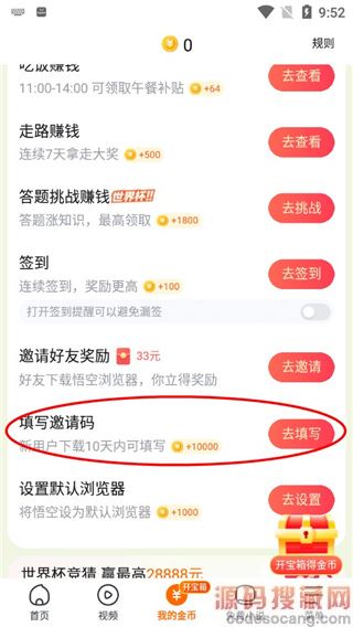 1、打开悟空浏览器首页,点击底部“我的金币”。