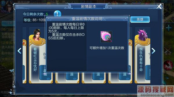 每个玩家,每日将获得5次重温剧情的机会。你也可以通过购买商城道具“五火七禽扇”来增加当日剧情次数。