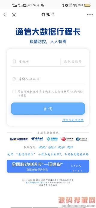 3、点击行程卡,然后输入自己的手机号码和验证码,即可在线查询自己的行程。