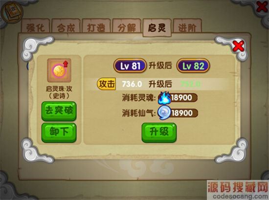 4、分解装备:在主界面的云中子处(炼丹炉)的分解界面,可以对装备进行分解,分解后可以获得一定量的仙气,值得注意的是,只有品质在蓝色及蓝色以上的装备才能进行分解哦!