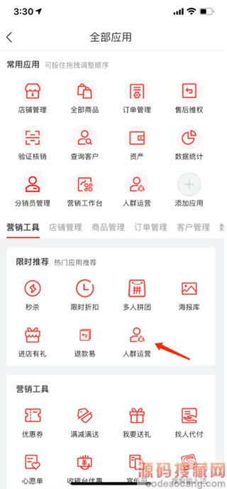 切换到APP首页,即“店铺”tab,点击“全部”,在“限时推荐”和“客户管理”里有“人群运营”入口,点击“人群运营”进入推荐人群列表。目前支持 访问未支付客户、需重点召回客户、需重点发展客户、需重点活跃客户、需刺激消费客户 5类人群创建运营计划。支持展示 5类人群的定义和覆盖人数。