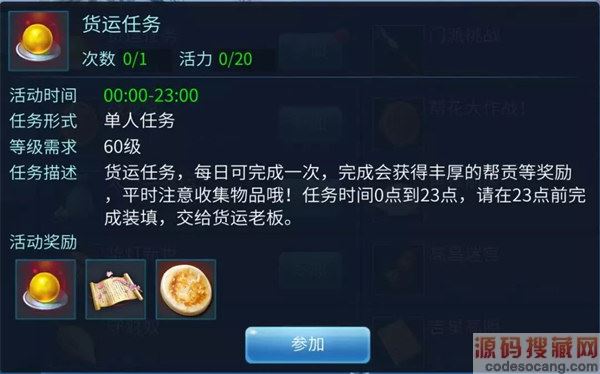 师训第十条:千里之行,始于足下。60级之后,就可以参加货运任务了,这是玩家主要得帮贡来源,记得常做。另外,如果你在60级成功与异性玩家牵手,还可以去完成情缘任务。