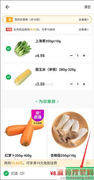 4、在购物车页面内,我们通过选中我们要结账的商品后,再点击右下角绿色的去结算按钮进行跳转。