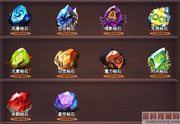 秘石一共分为10种,分别为:风暴秘石、空间秘石、暗影秘石、无限秘石、元素秘石、心灵秘石、重力秘石、时间秘石、杀戮秘石和星空秘石。