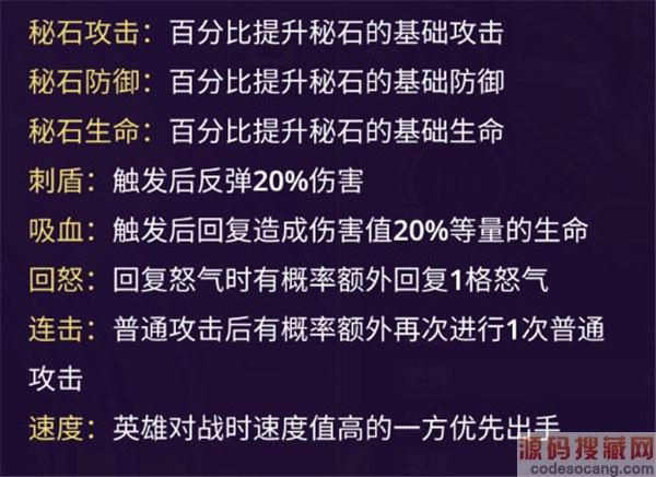 秘石的非固定属性是在攻击、速度、防御、刺盾、连击、生命、吸血、回怒、秘石攻击、秘石防御和秘石生命中随机抽取的,每颗秘石最多有几率拥有4条非固定属性,在强化秘石时,每强化3级会随机增加一条非固定属性的属性值。