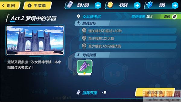 1、点击进入之后,我们可以看到每一关的挑战目标以及可能掉落的装备,另外需要提到的是,每次进入都需要消耗我们的体(节)力(操)哦。