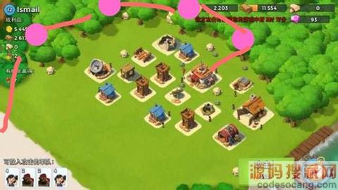 这玩家情况就是大部分防备建筑物都在前面本后面无防备,可以用胖子配合mm跟着红色路线走不打任何防备走到本后面偷本了。