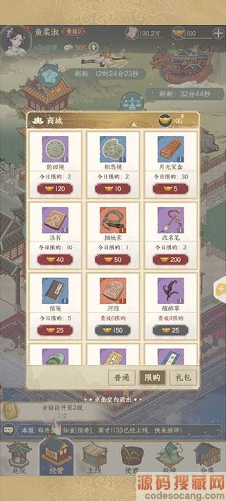 元宝商铺分为“普通”“限购”“礼包”,使用元宝可购买相应的道具物品。