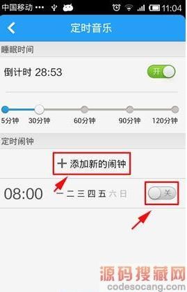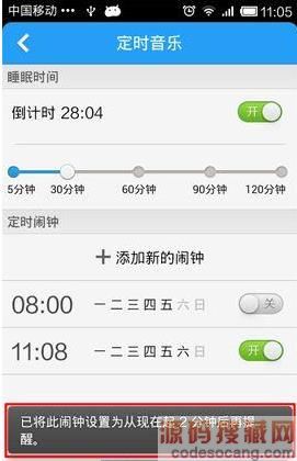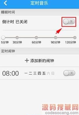 2、点击“定时音乐”进入界面。在睡眠时间倒计时点击开启按钮,刚开启时是设定为5分钟后退出,你可以根据实际情况设定播放器将在多少分钟后自动关闭