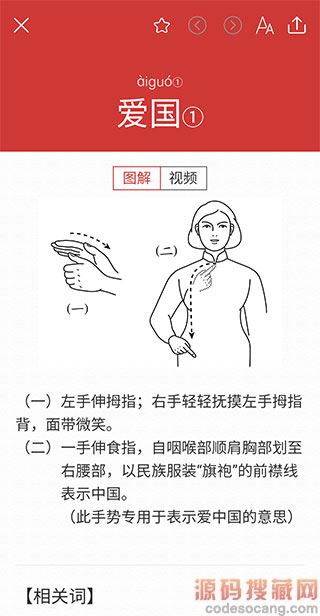 3、当我们搜索到自己想要查询的词语,下方就会显示手语图解,以及相关词联想。