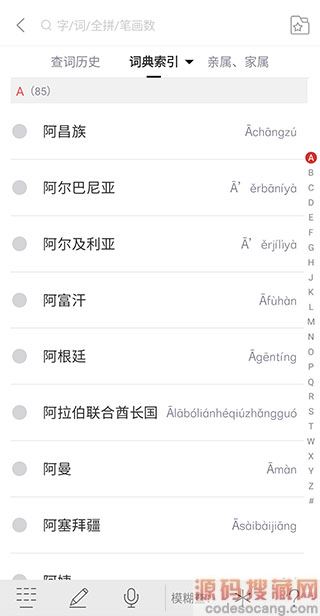 4、在查询页右滑还能切换到词典索引页,这里的索引都是按照字母顺序进行排列的。