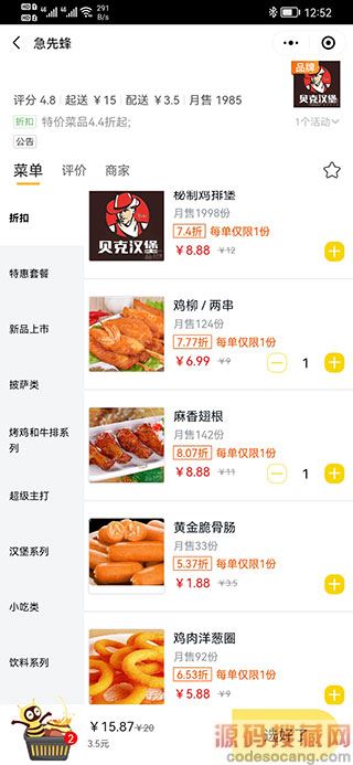 3、点击店名,就可以进入店中点餐了,还可以看到起送价格,配送费是多少,还有月售、菜单、评价、商家。