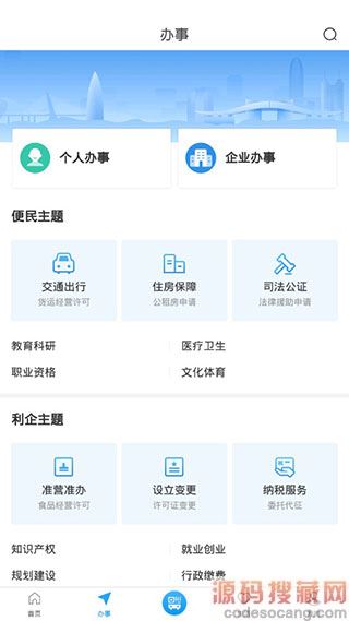 3、在底部点击“办事”栏,可选择“个人办事”或“企业办事”两大类别,按“主题”或按“部门”寻找自已所需的服务。