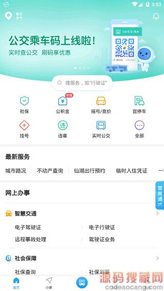 2、打开手机上的“i深圳”APP,默认显示首页。在搜索框输入自已所需要的服务,如社保、公积金、实时公交等,即可进入办理该项服务。