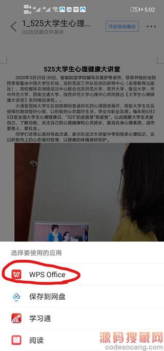 6、选择了其他应用打开后,会弹出选择要使用的应用,选择WPS Office(此操作需用到手机版WPS,若没有下载,在手机应用里可以找到)。