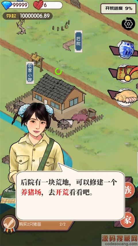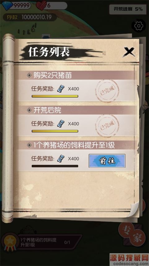 5、然后可以通过任务来看看接下来要做什么,完成过后的任务还可以获得对应的奖励,比如购买2只猪苗以及开荒后院;
