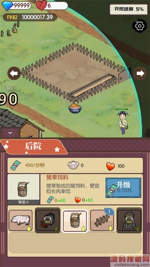 6、接下来我们就要去将1个养猪场的饲料提升至1级;点击后院,点击猪草饲料(猪草制成的猪饲料,便宜但长肉率低),然后点击升级;