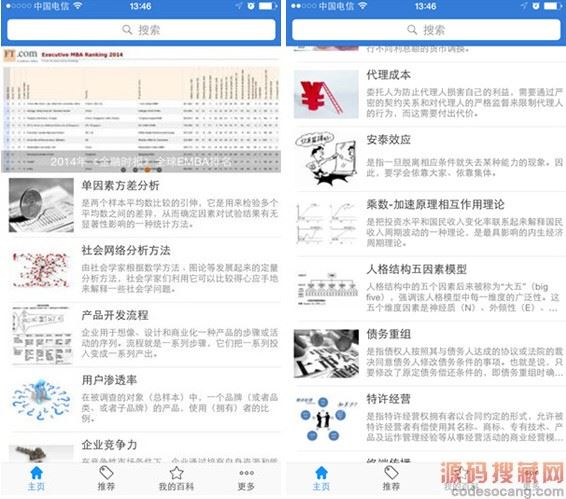 而在焦点图下方,垂直排列的就是众多热门词条的列表,在这用户可以了解到其他用户近期的关注点所在,从而有针对性的了解一些专有名词。而页面的整体设计采用简单的风格,垂直排列的方式也比较符合大多用户的阅读习惯,单手转页面轻松自如,让用户可以充分利用工作之余的碎片时间进行阅读,在不耽误工作效率的前提下,轻松的提高自身能力。