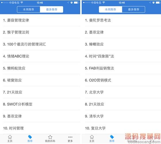 除主页外,MBA智库百科还设有推荐阅读页。推荐阅读页共分为两个部分——本周推荐与最多推荐,页面中按热门程度分别为用户列出10个本周或近期比较热门的名词供用户了解。