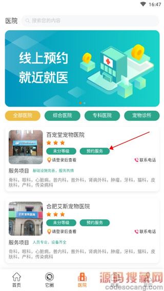 2、进入【医院】页面,选择就近医院,或是根据疾病类目选择,点击进入还可以查看医院更详细的信息。