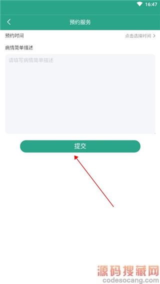 3、进入【预约服务】页面,填写【预约时间】及病情简单描述后,点击【提交】即可。
