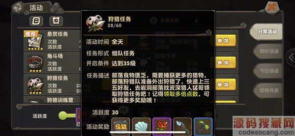 狩猎任务全天开启,不分时间段,只要你在线就可以做,去岩洞部落找到资深猎人猛哥就可以去狩猎啦!该任务给的经验值十分丰厚,一般狩猎一只猎物,就可以看到经验条有明显的变化。