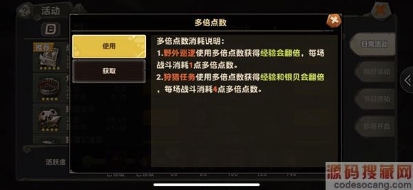 小Tips:因为经验丰厚,所以大家做之前千万别忘了领取多倍点数,多倍点数可以让【狩猎任务】所获得的经验和银贝翻倍,每场会消耗4点点数,每天零点自动增加120点,最多可以保留1200点。多倍点数还适用于【野外巡逻】的挂机活动中,挂机前不要忘记适用哦!