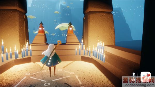 雨林神庙的入口在密林遗迹的高处,玩家需要借助透明水母强大的光之能量跨越悬崖。巨型水母具有一定的吸力,控制好飞行的起幅和落点去靠近水母,旅人们就可以被水母吸附住,逐个跳跃便可到达神庙。