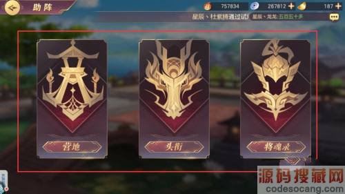 3、助阵可以提升战力,助阵分为营地、头衔、将魂录。