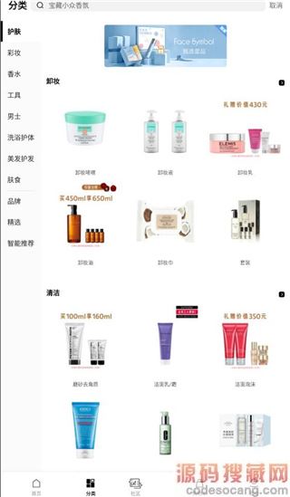 5、在分类中,有着彩妆、洗浴护体、美发护发、品牌、智能推荐、肤食、工具等分类。