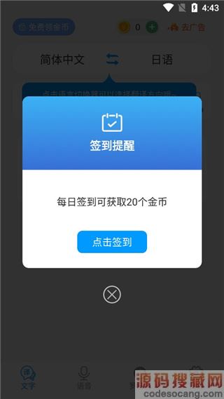 1、进入软件会有签到提醒弹窗跳出,点击签到可以获取二十个金币;