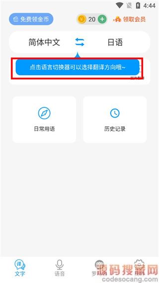 2、在本页面的顶端点击箭头语言切换器可以选择翻译的方向;