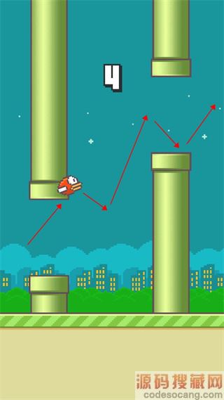 小鸟的跳跃是个锯齿状,靠点击屏幕来获得上飞的力量。你知道路线是锯齿状的,那么你对小鸟的下一步就有了预期和判断,这样就不至于掉在地上或者是撞向柱子。要想过更多关卡,就必须在上下柱子之间起跳,起跳是需要与下面柱子隔一定距离。