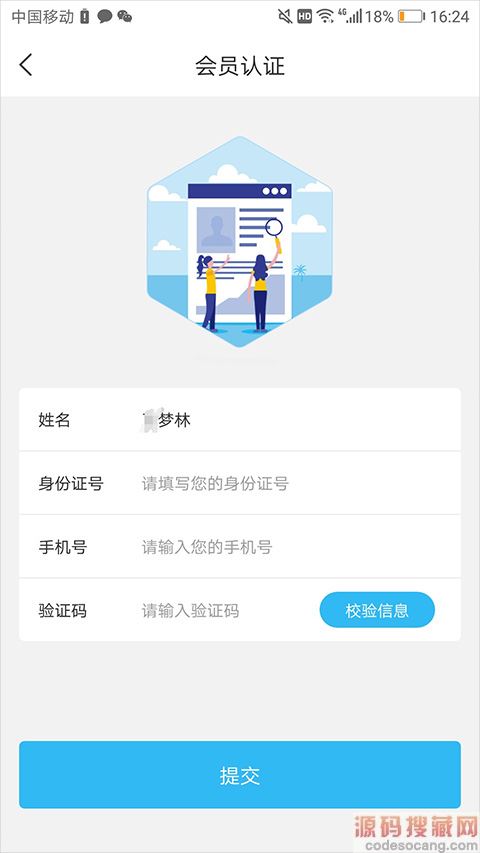 3、在打开的认证页面中,依次输入姓名、身份证号、手机号,以及输入通过点击【校验信息】获取到的验证码,输入上述信息后点击【提交】;