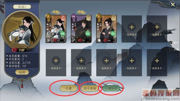 2、配置好队伍后可点击行囊,将仓库中的药品,道具等转移至行囊内,待队伍返回宗门后,也可将交货物资转移至宗门仓库。队伍需要返回宗门后才可对队伍中的弟子进行重新编辑。
