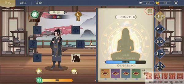 2、在该界面内,可装备功法,查看属性,身世并对装备进行培养,详细功能介绍诸位掌门可以通过界面中的感叹号进行查看。