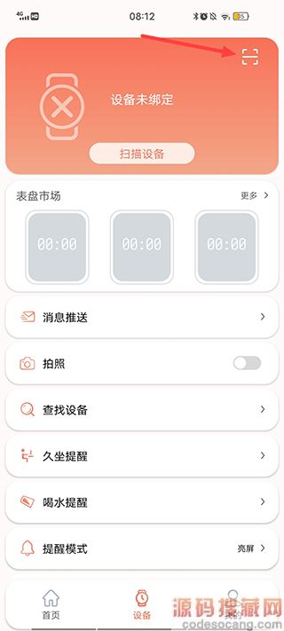 1、打开RDFit手表软件,点击设备界面右上角的扫描框;