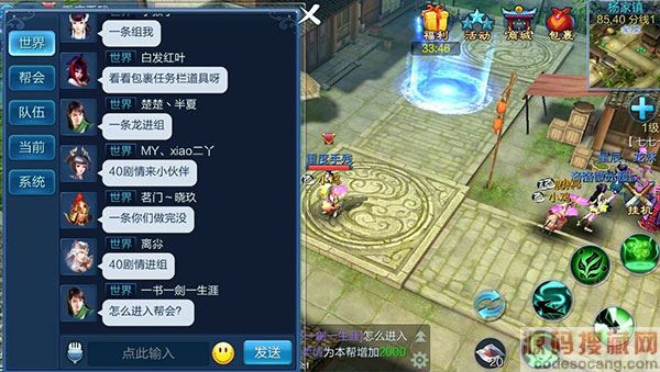 6、想在倩女世界中寻觅新朋友,或者想与老朋友聊天联络感情的玩家,长按左下角的话筒按钮,即可选择在世界、帮会、队伍频道实时发语音!点击下方的小气泡,可以输入文字发言,左侧按钮提供多个频道选择,点击即可随意切换!