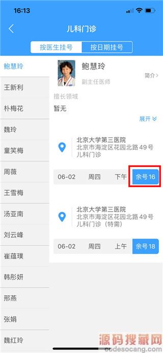 5、选择一位医生,只能选择有余号的医生,点击【余号】。