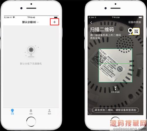 1、复位摄像头,使其指示灯变为红绿交替闪烁。登录TP-LINK安防APP,点击设备主界面右上角【+】,扫描摄像头背面的二维码;