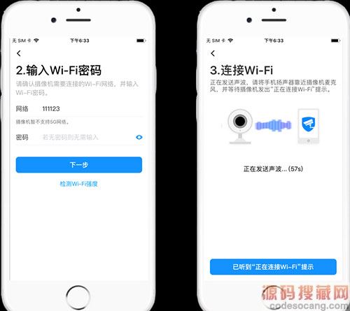 2、扫码成功后,按照向导输入Wi-Fi密码进行声波配置,配置完成后即可在设备列表查看摄像头。