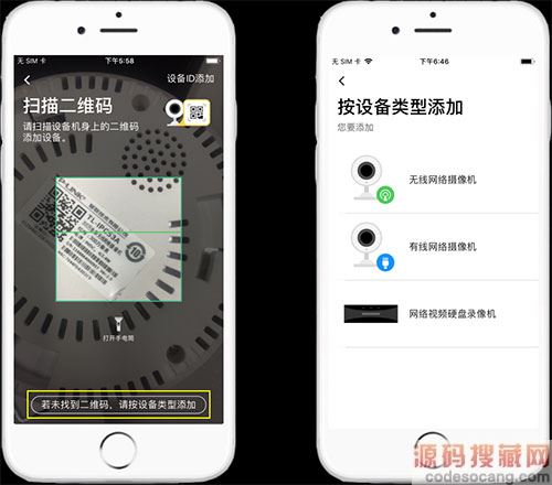 1、对于一些没有二维码或不方便扫描二维码的无线摄像头可按设备类型添加。在扫描二维码的下方点击按设备类型添加,选择【无线网络摄像机】进行配置;