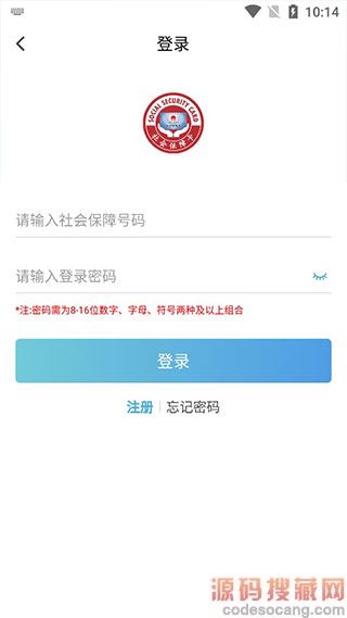 2、输入社保卡号码(一般是身份证号码)以及登录密码。如果首次使用,可以点击注册,进行人脸识别设置密码。