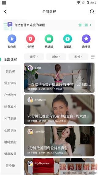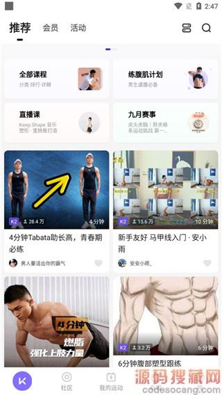 1、在app的首页里拥有多种课程、练腹肌计划、直播课以及视频可进行学习;