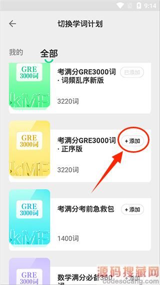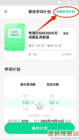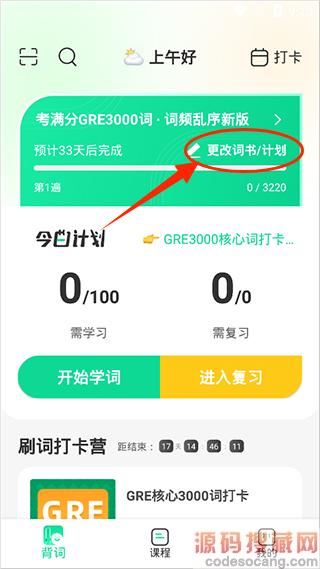 1、下载并打开GRE3000词app,选择“更改词书/计划”选项。