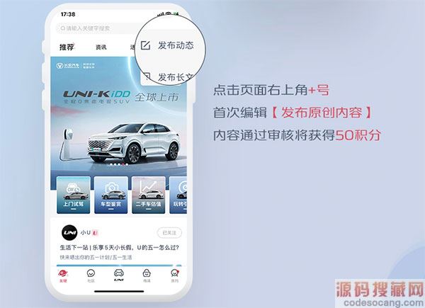 3、点击页面右上角+号,首次编辑发布原创内容,内容通过审核将获得50积分。