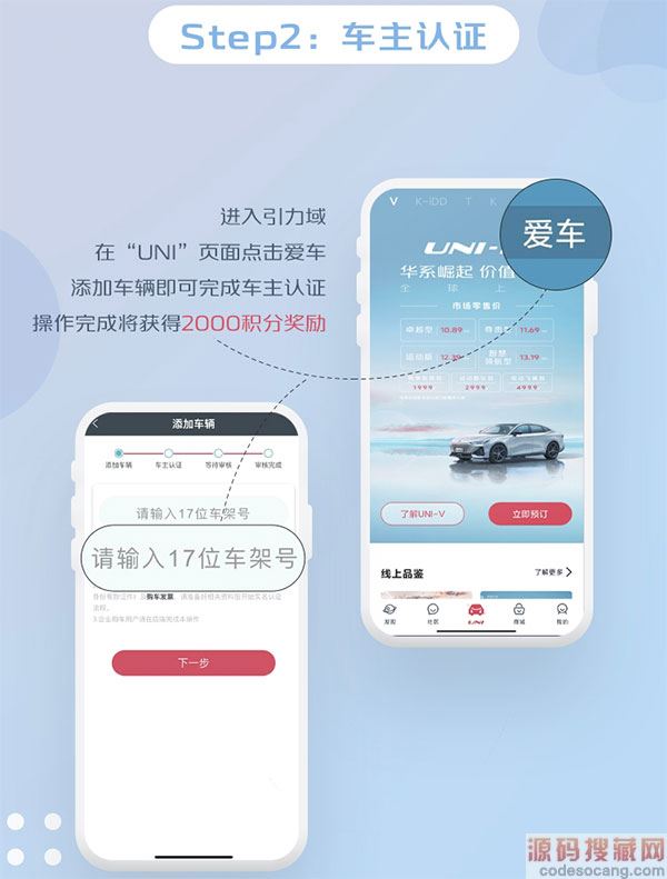 1、进入app,在UNI页面点击爱车,添加车辆即可完成车主认证,操作完成将获得2000积分奖励。